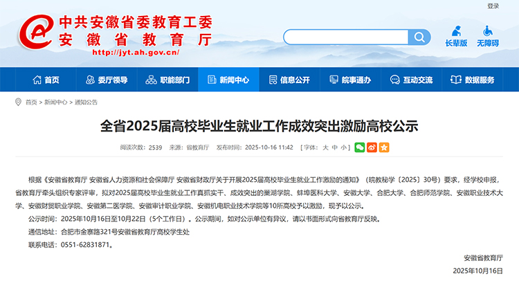 近日,安徽省教育厅发布《全省2025届高校毕业生就业工作成效突出激励高校公示》。经学校申报,省教育厅牵头组织专家评审,拟对2025届高校毕业生就业工作真抓实干、成效突出的巢湖学院、蚌埠医科大学、安徽大学、合肥大学、合肥师范学院、安徽职业技术大学、安徽财贸职业学院、安徽第二医学院、安徽审计职业学院、安徽机电职业技术学院等10所高校予以激励,现予以公示。 来源:安徽省教育厅 关键词: 就业工作 819 次浏览 栏目 新闻资讯
