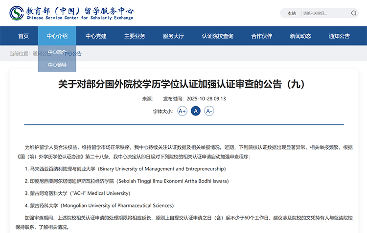 10月28日,教育部留学服务中心发布《关于对部分国外院校学历学位认证加强认证审查的公告(九)》,决定对4所海外院校的相关认证申请启动加强审查程序。