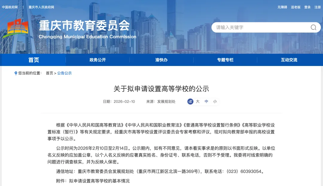 2月10日,重庆市教委网站发布关于拟申请设置高等学校的公示。