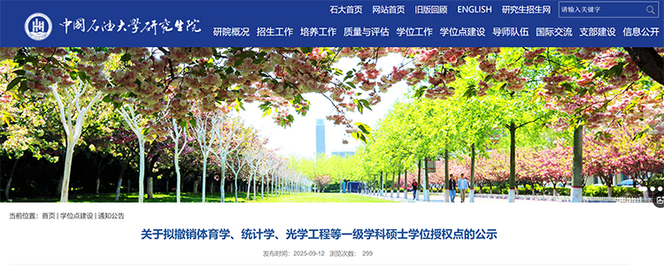 近日,中国石油大学(华东)研究生院网站发布拟撤销硕士学位授权点的公示。 根据国家《博士、硕士学位授权学科和专业学位授权类别动态调整办法》(学位〔2020〕29号)要求和相关工作程序,拟撤销体育学、统计学、光学工程等3个一级学科硕士学位授予点。 来源:中国石油大学(华东) 关键词: 中国石油大学(华东) 1160 次浏览 栏目 新闻资讯